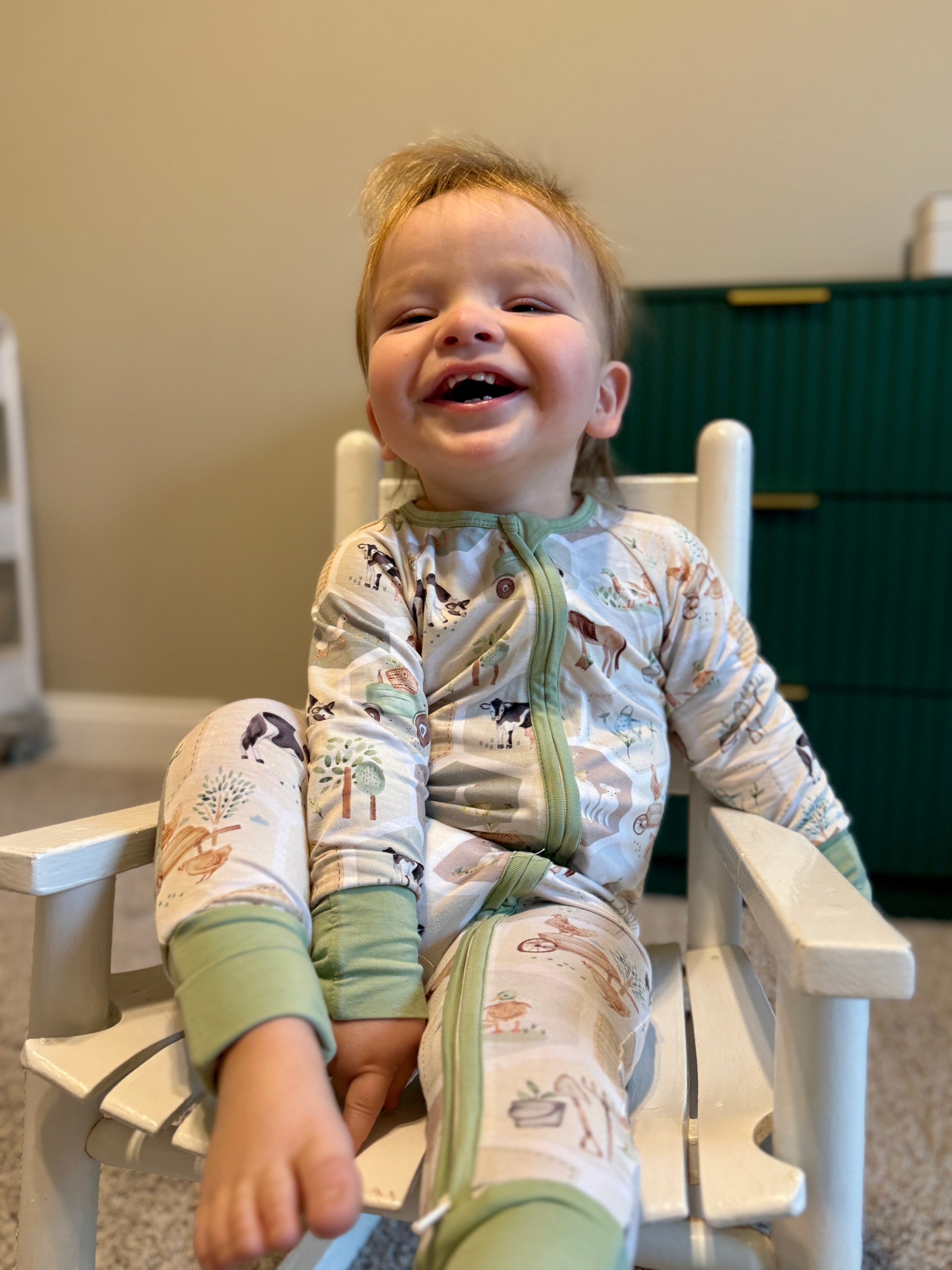 This adorable farm themed zippy is perfect for cozy nights or playtime on the go! A soft, neutral farm theme with patchwork designs showcasing cows, horses, ducks, tractors, barns, and gardening tools. This sweet neutral look is for everyone, including mom!