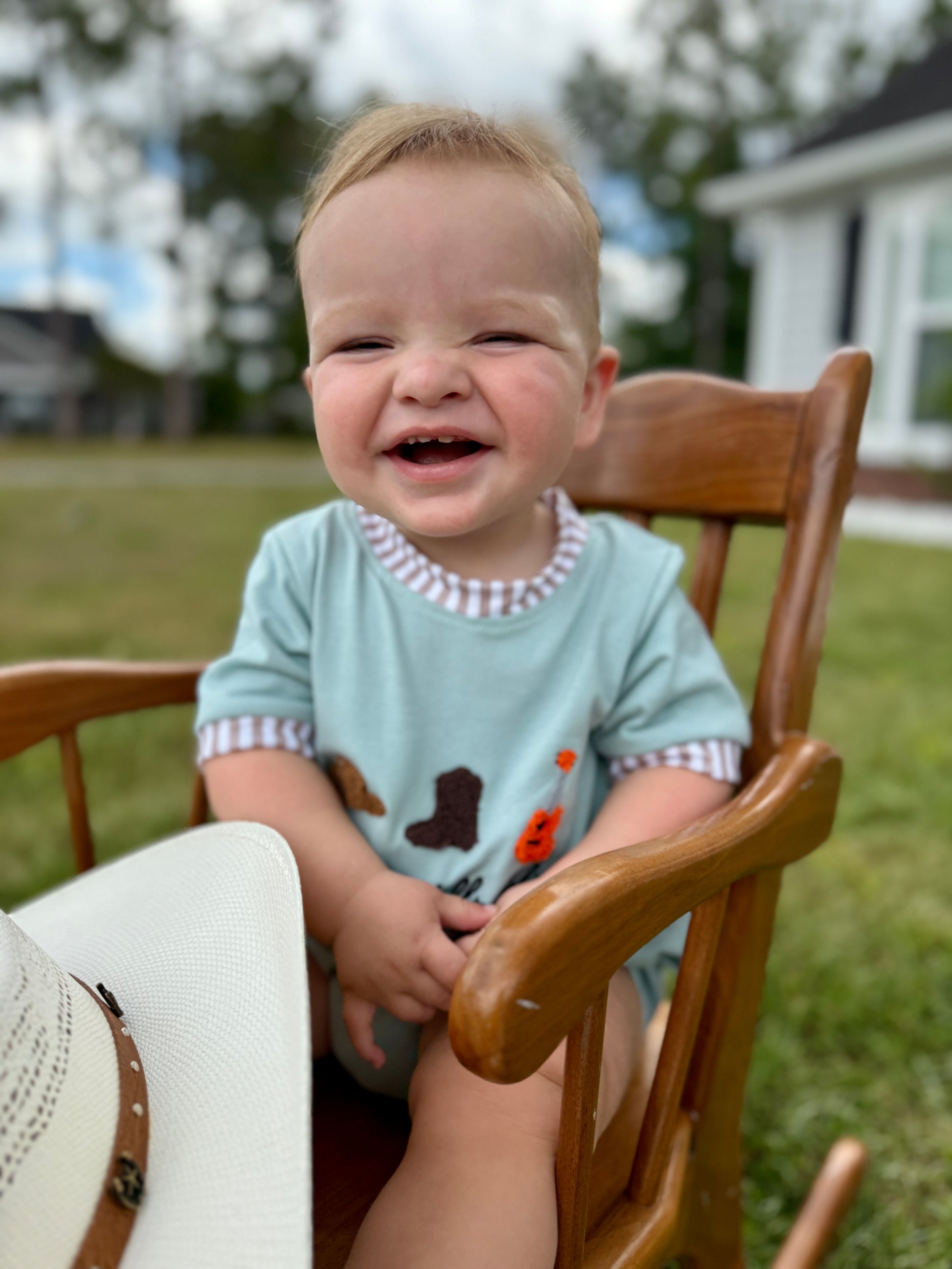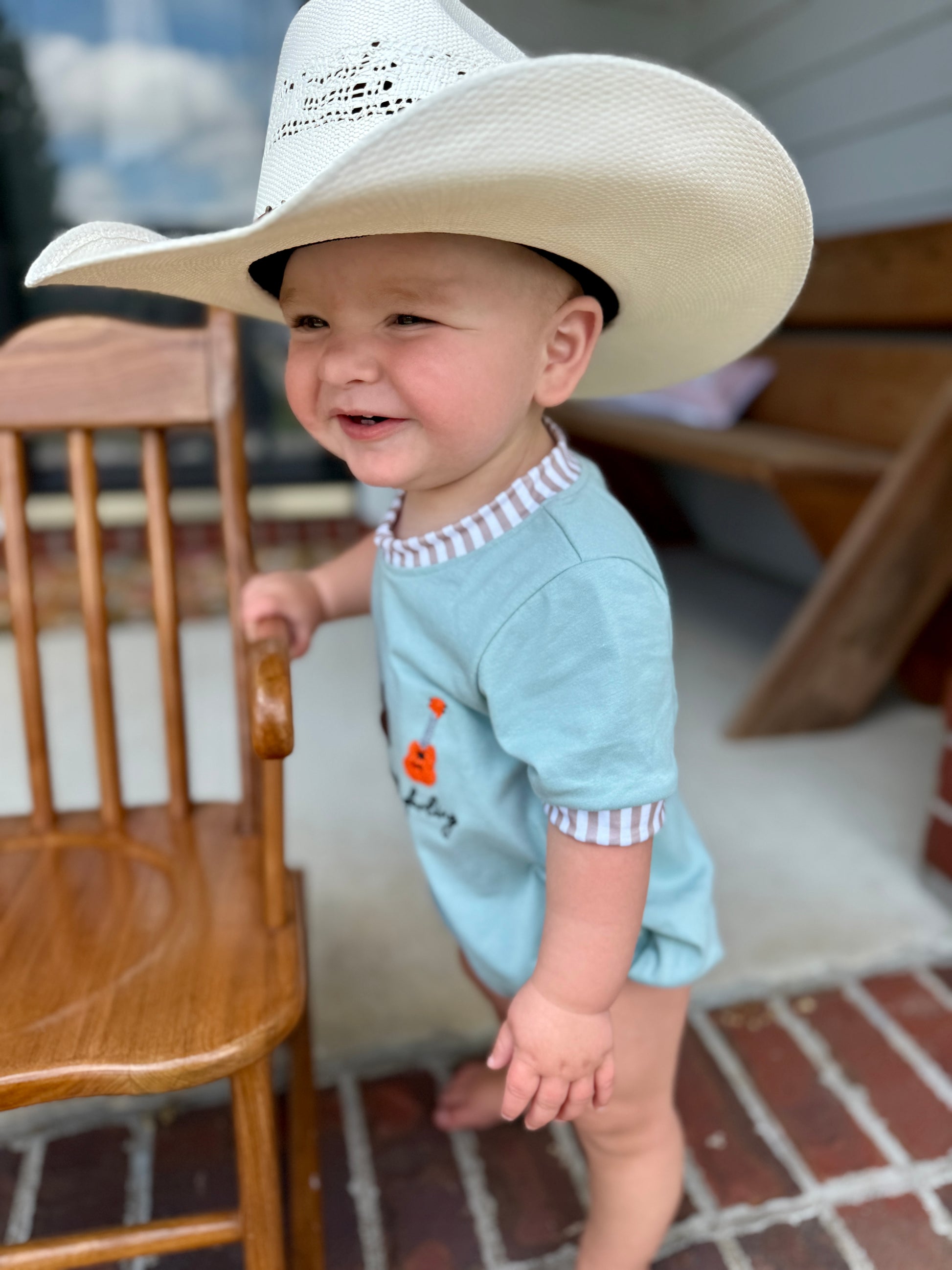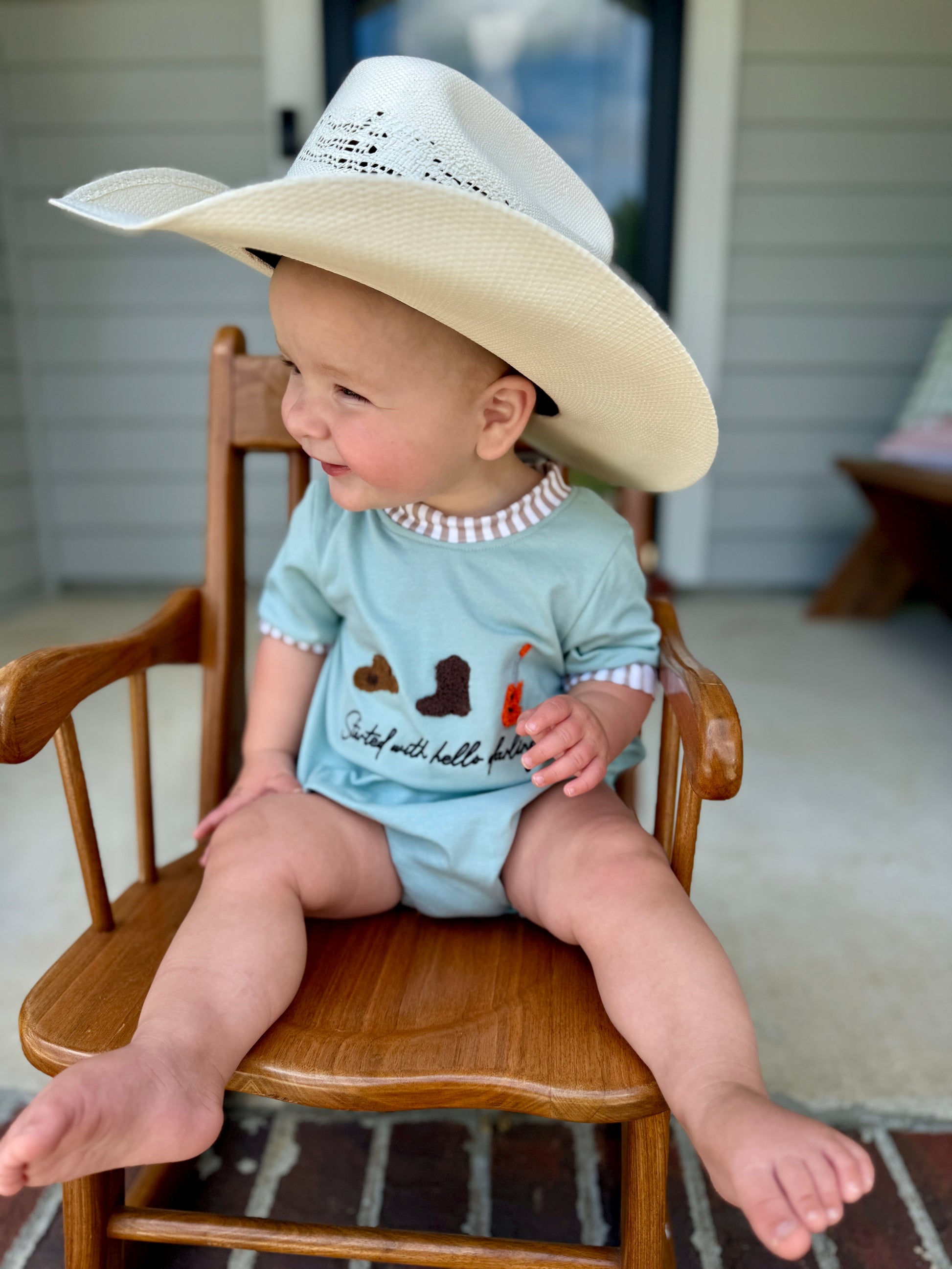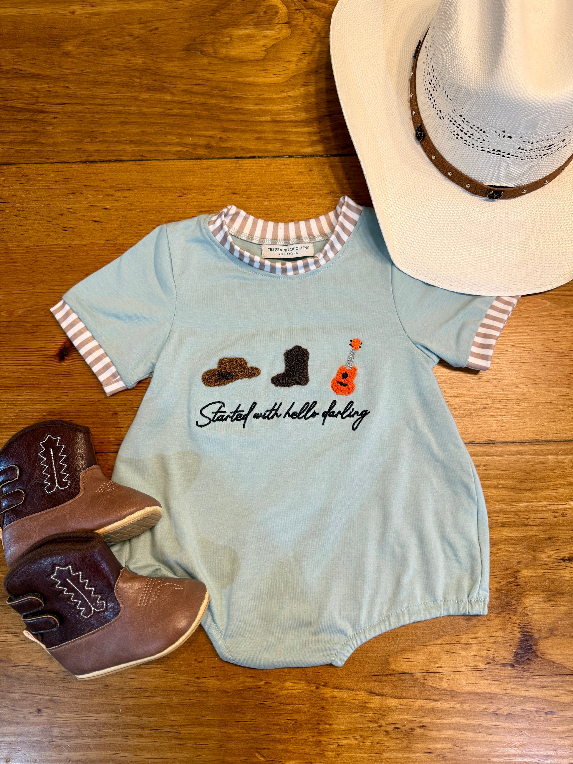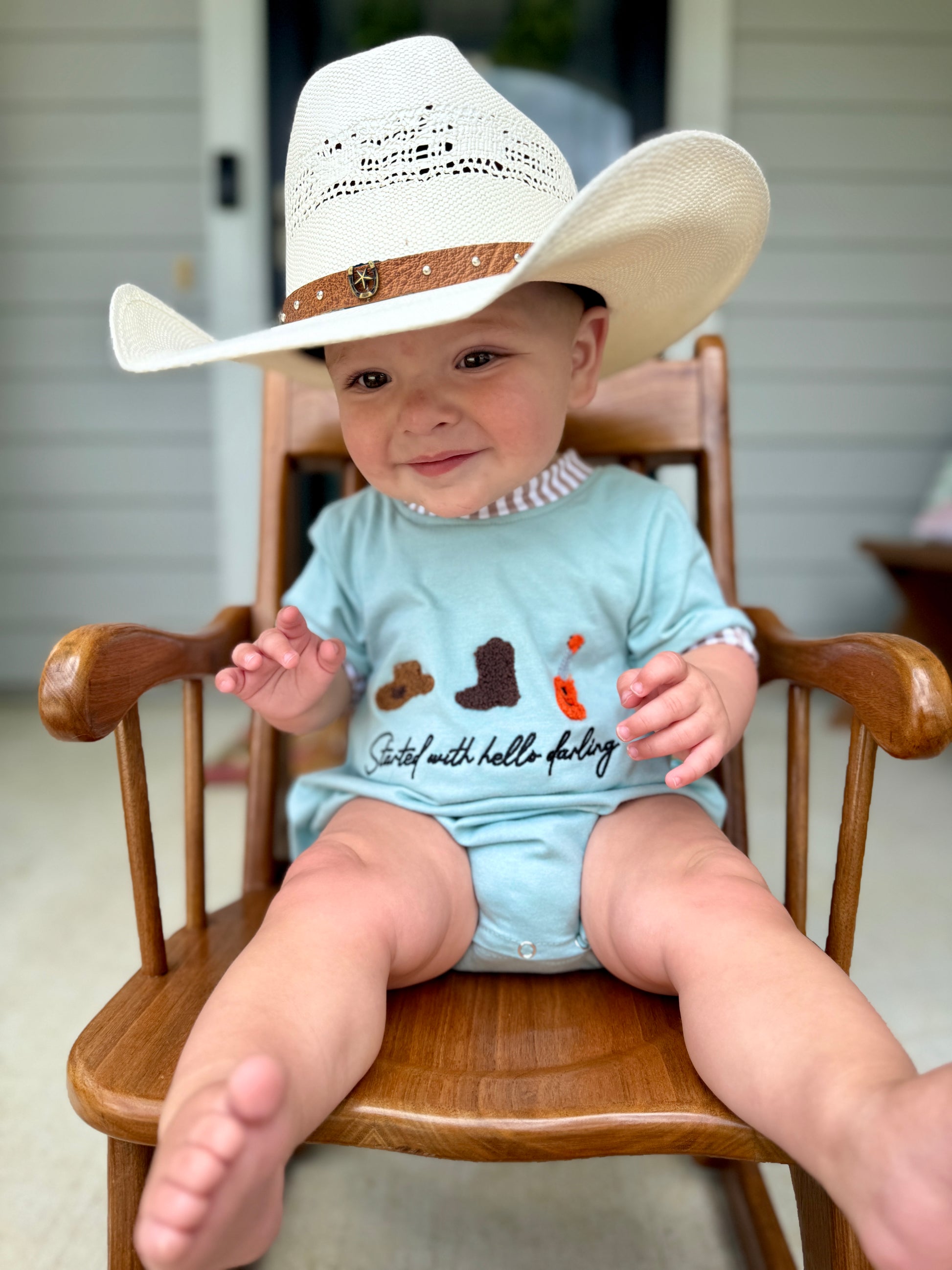 This soft blue bubble is a Peachy Duckling original! This is perfect for your little cowboy or cowgirl in the making - started with hello darlin!