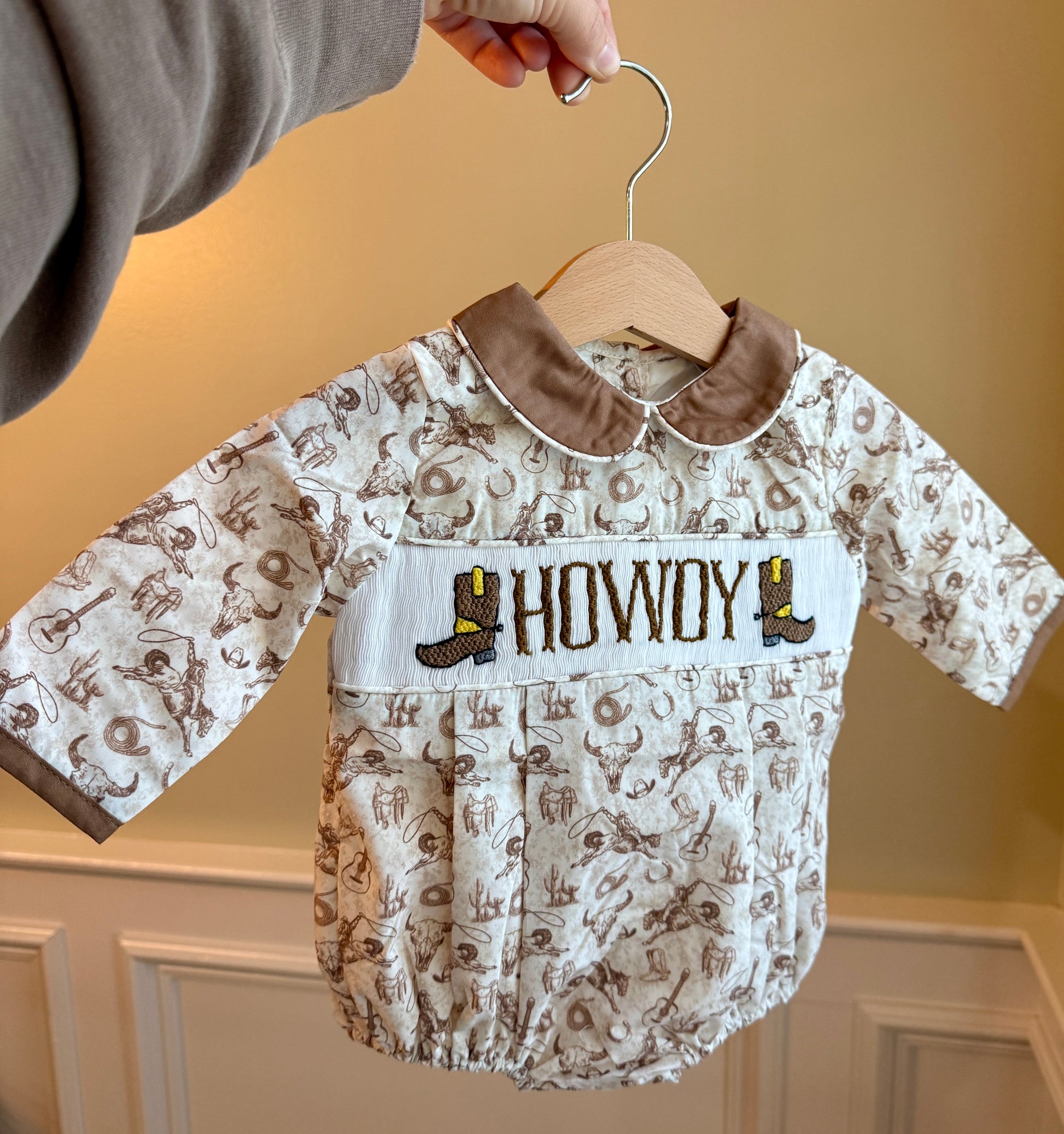 Say "Howdy" in the sweetest way! This western inspired bubble is full of charm with its cowboy print featuring lassos, boots, and guitars. The peter pan collar adds a classic touch to this adorable smock!