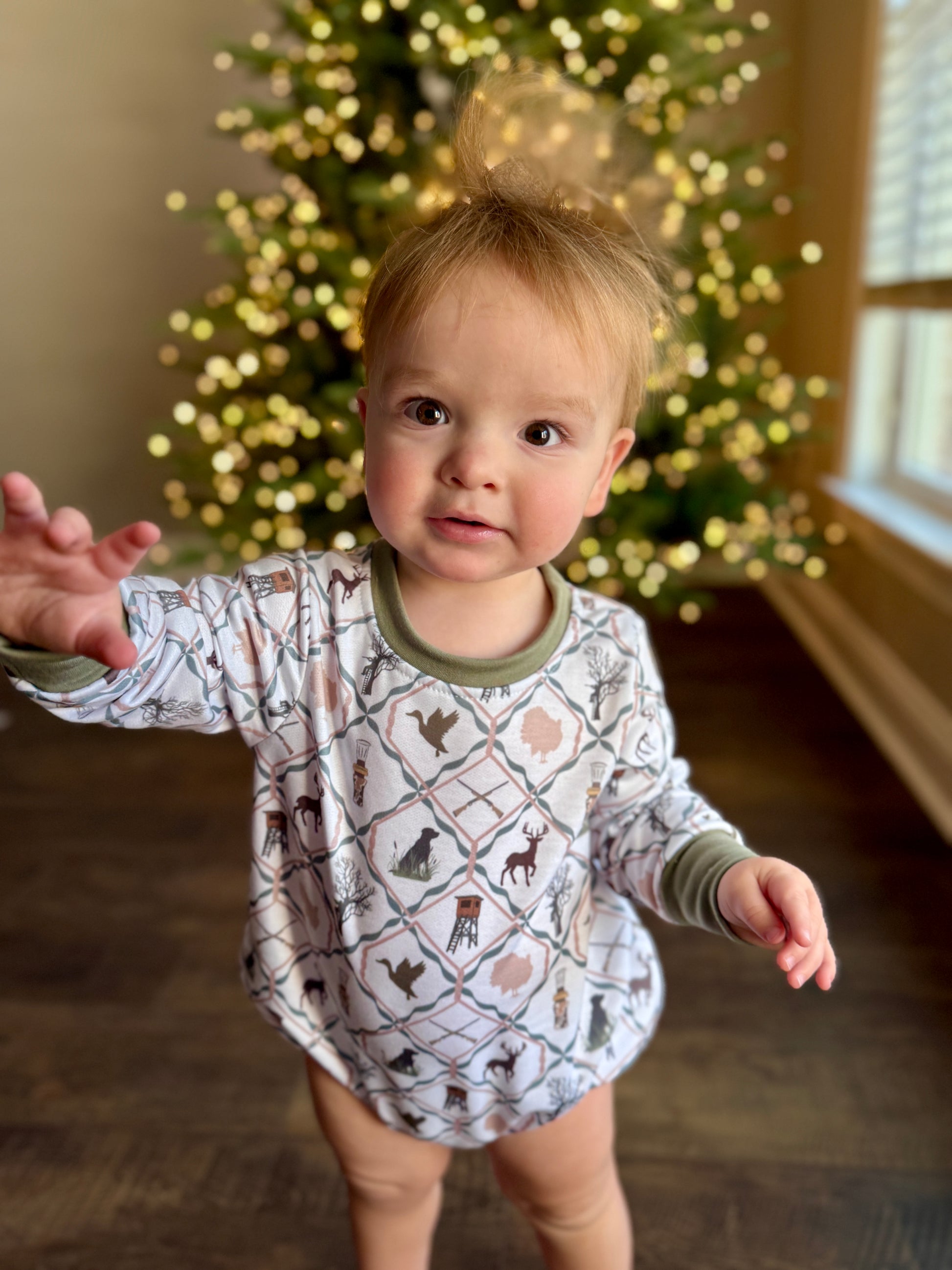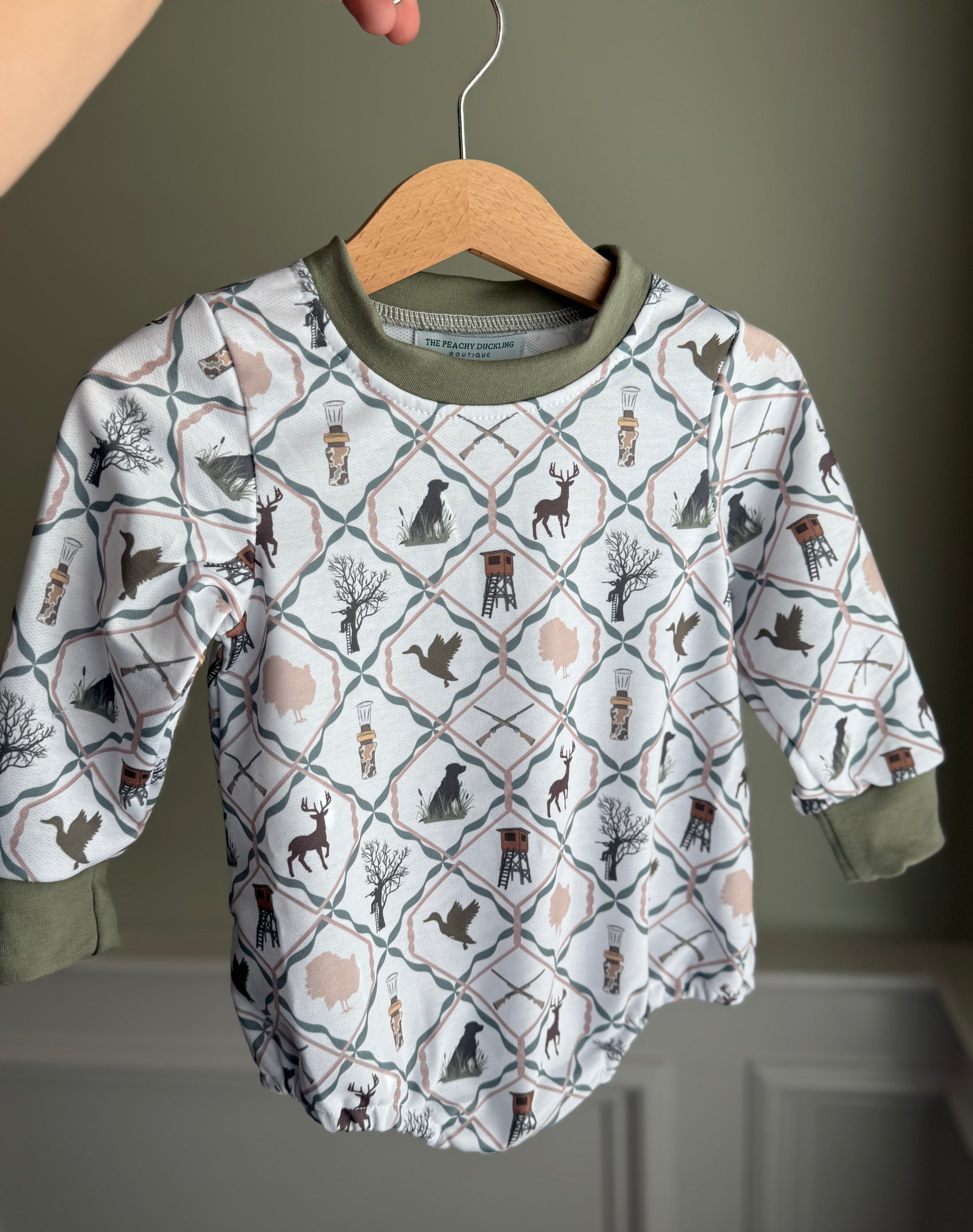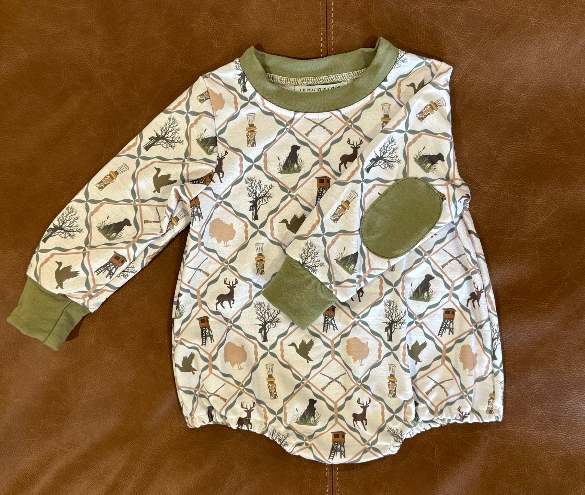 A Peachy Duckling exclusive print is here in this adorable bubble! This Hunting Trellis bubble is lined knit cotton and the elbow patches add a little touch of style for your little one! Complete the look with matching set!