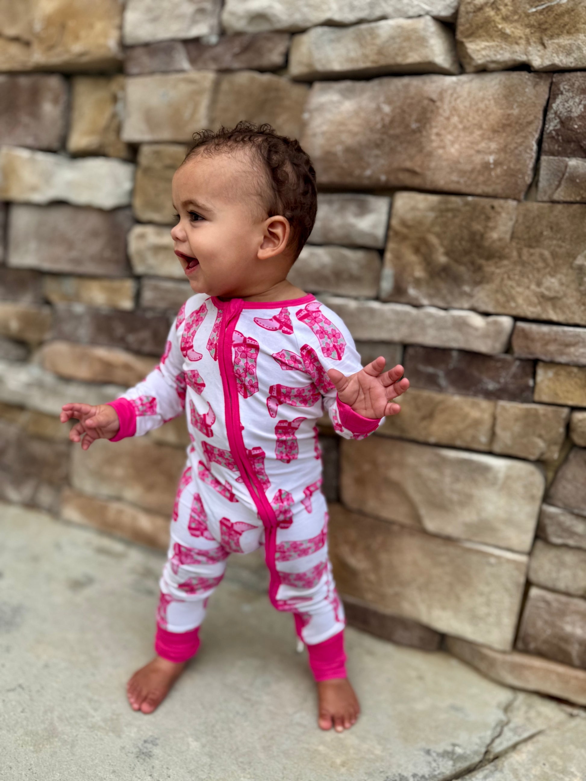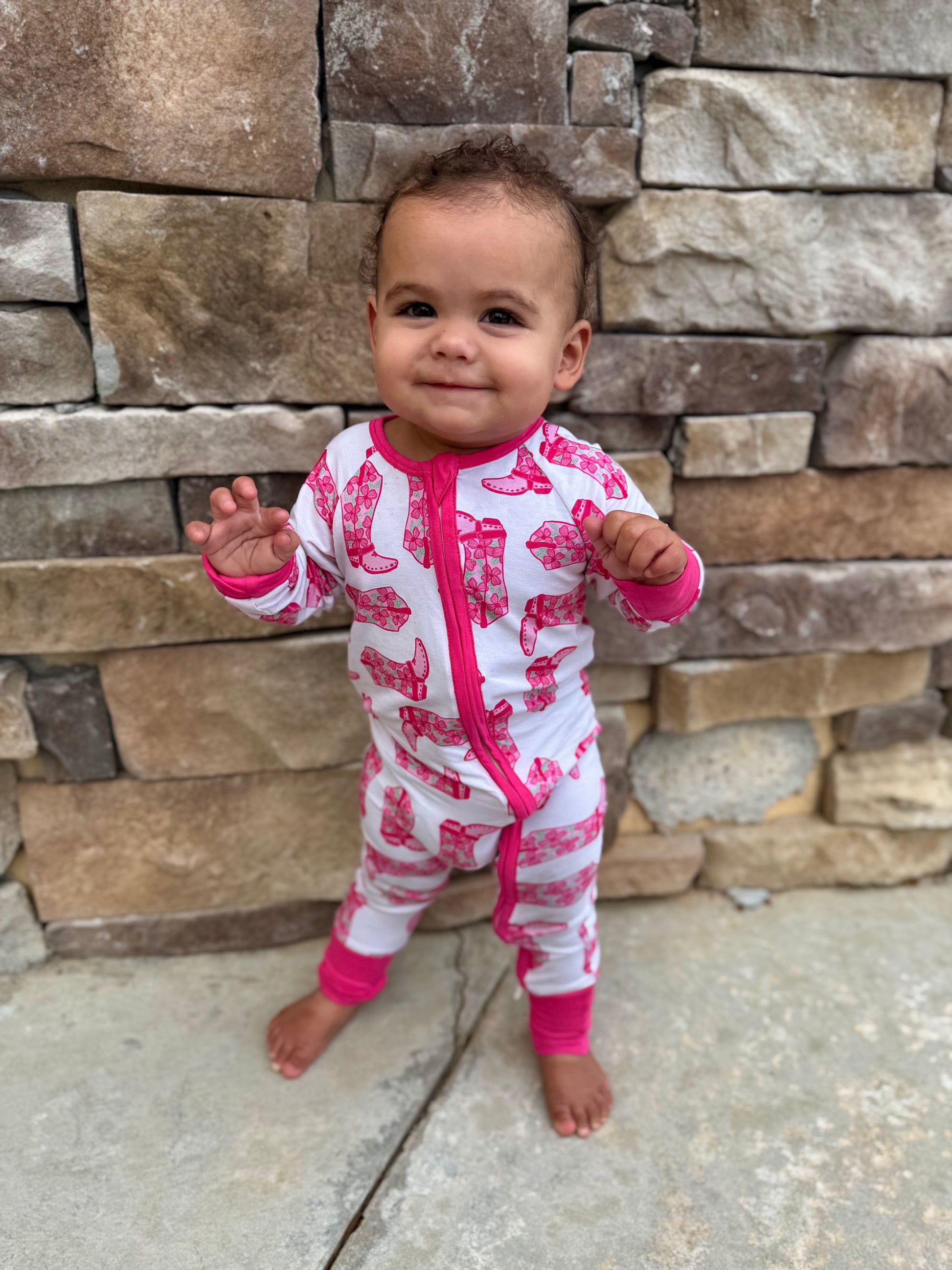 Stylish and adorable for bed?! YES! We adore this print! Floral pink cowgirl boots are perfect for your little girl! Breathable and soft bamboo zippy with fold over cuffs and double zipper!